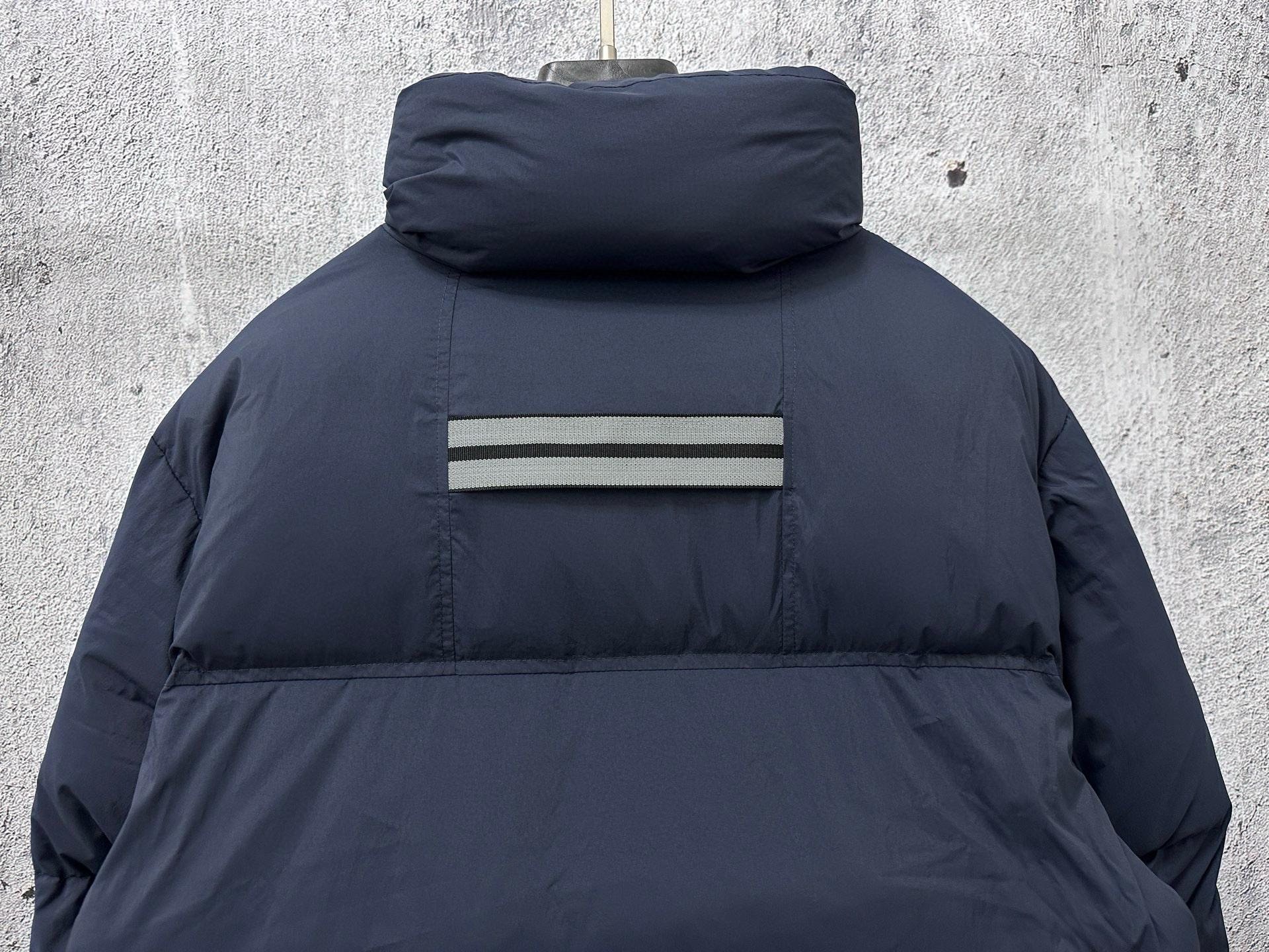 Fill collar and reflective double stripe grab strap. Extended hem, ribbed knit cuffs.